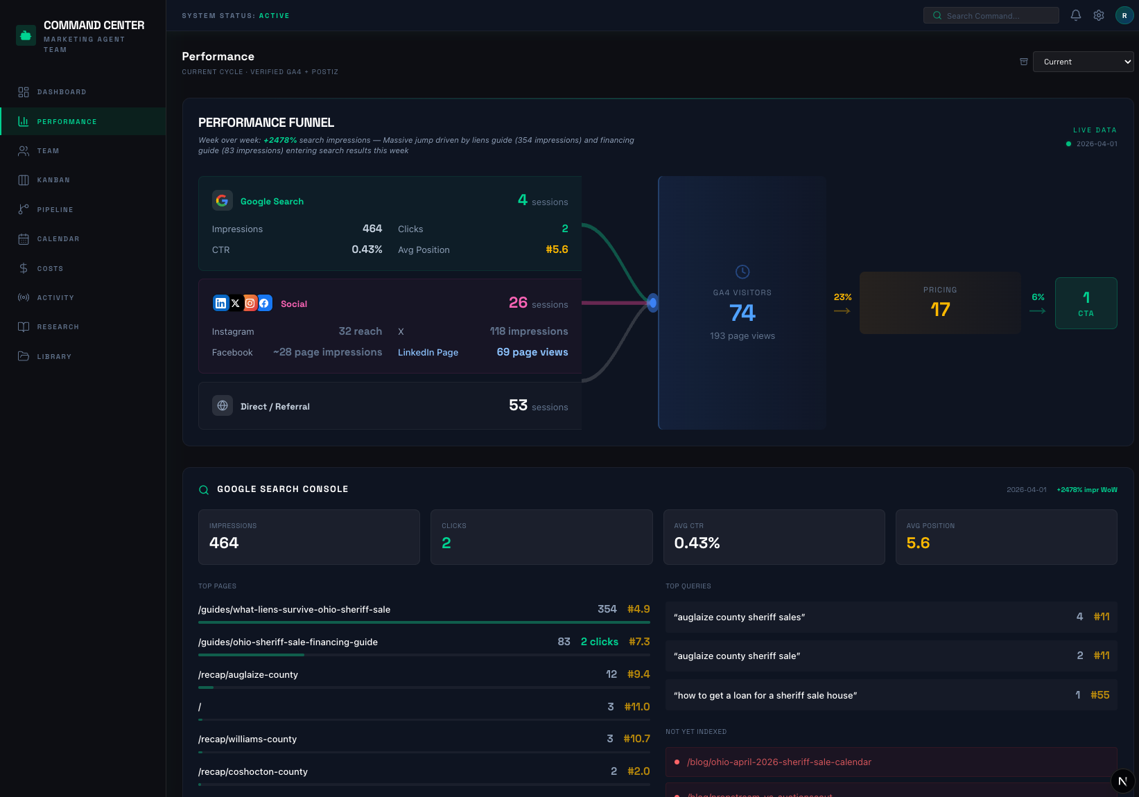 The marketing director closes the loop by measuring performance after content goes live. She pulls data from GA4, Google Search Console, and social platforms to see what's working and what isn't. That analysis directly informs the next round of task assignments. Here's what that looks like in the command center: